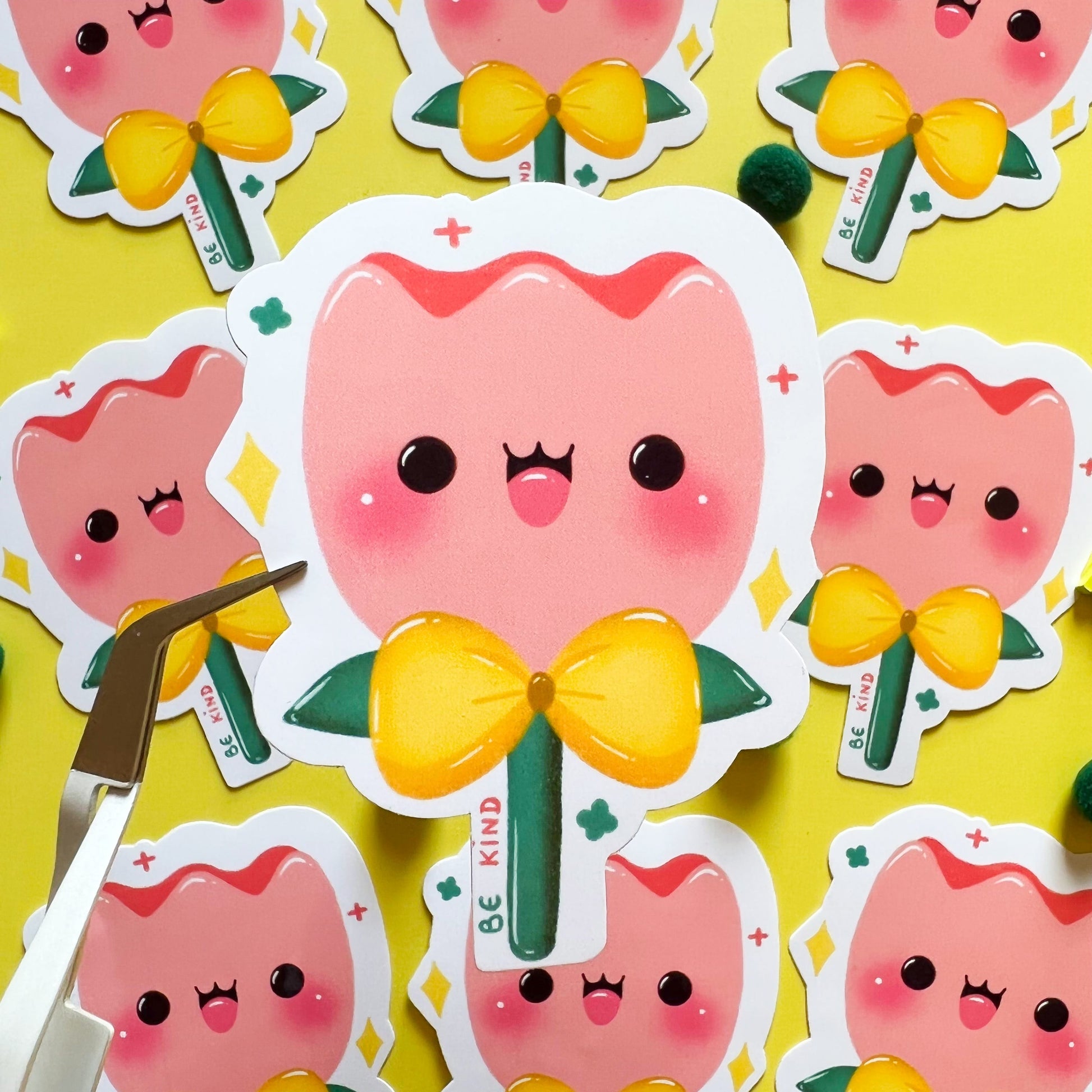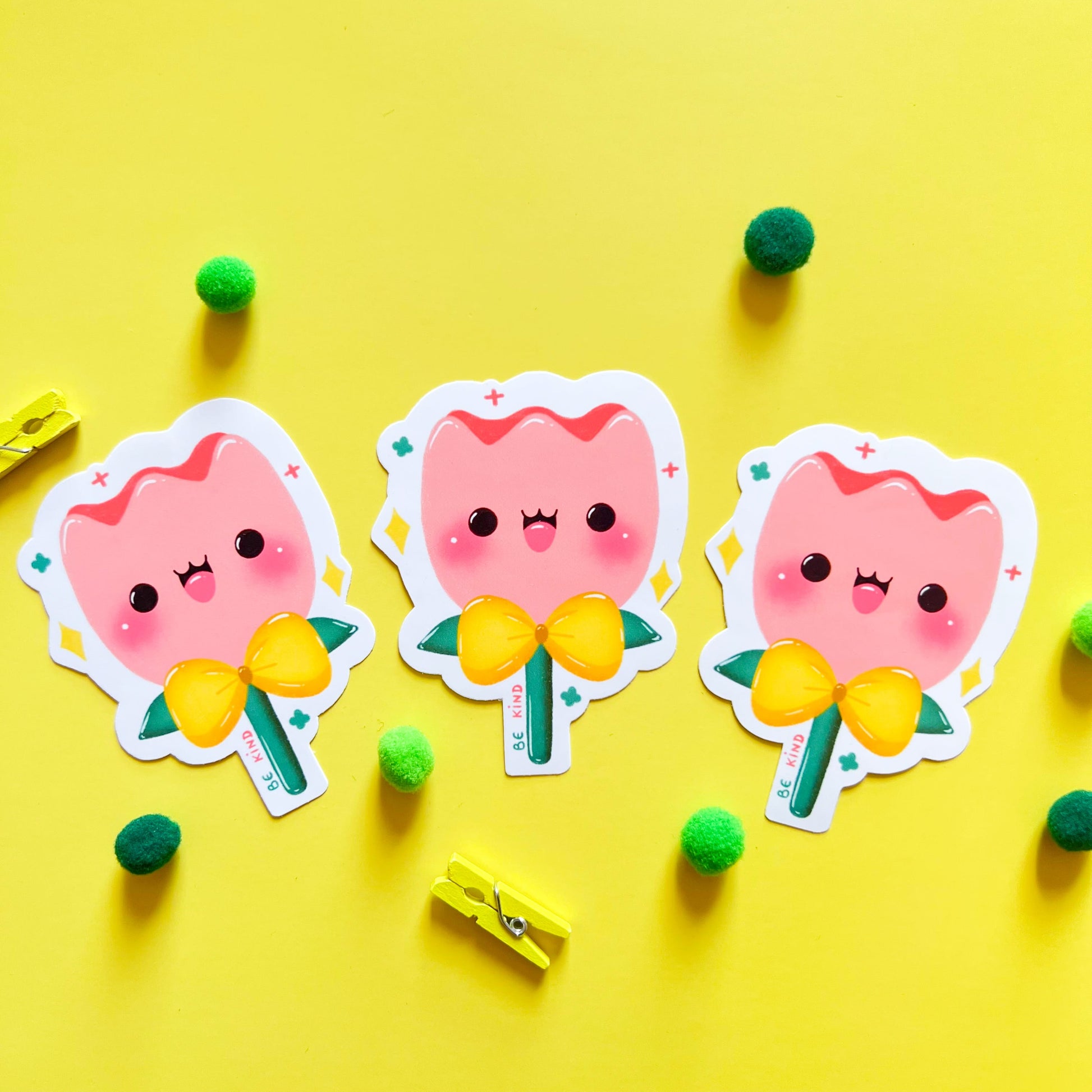 The tulip, with its delicate petals and cheerful hue, is highlighted by the striking contrast of a vibrant yellow bowtie. This detail adds an element of surprise and style to the sticker, creating a perfect combination of sweetness and playful elegance.