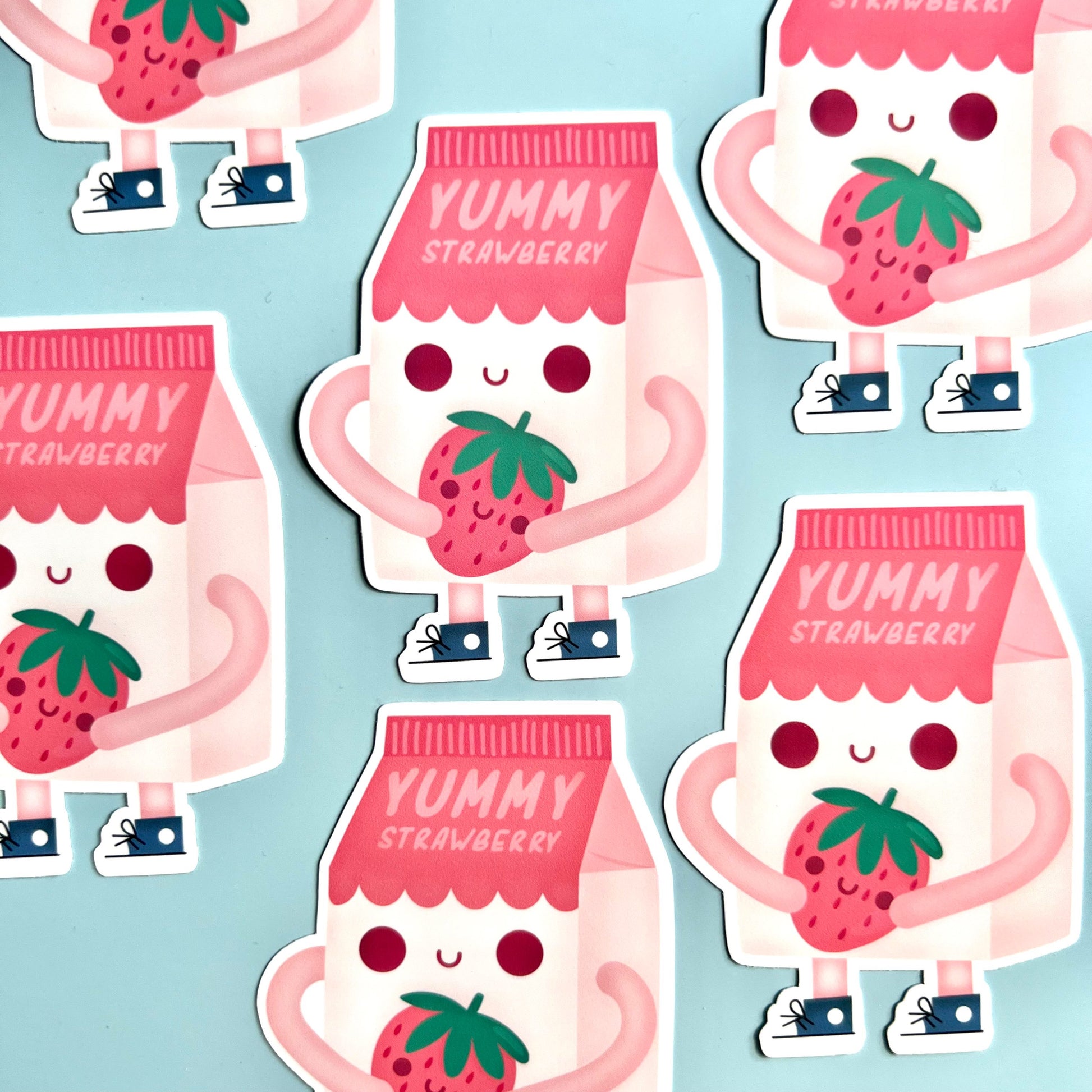 Picture a strawberry milk bottle coming to life with delicate arms waving joyfully, and dainty legs adorned with blue shoes. This super cute design is sure to melt the hearts of those who cherish the kawaii aesthetic.