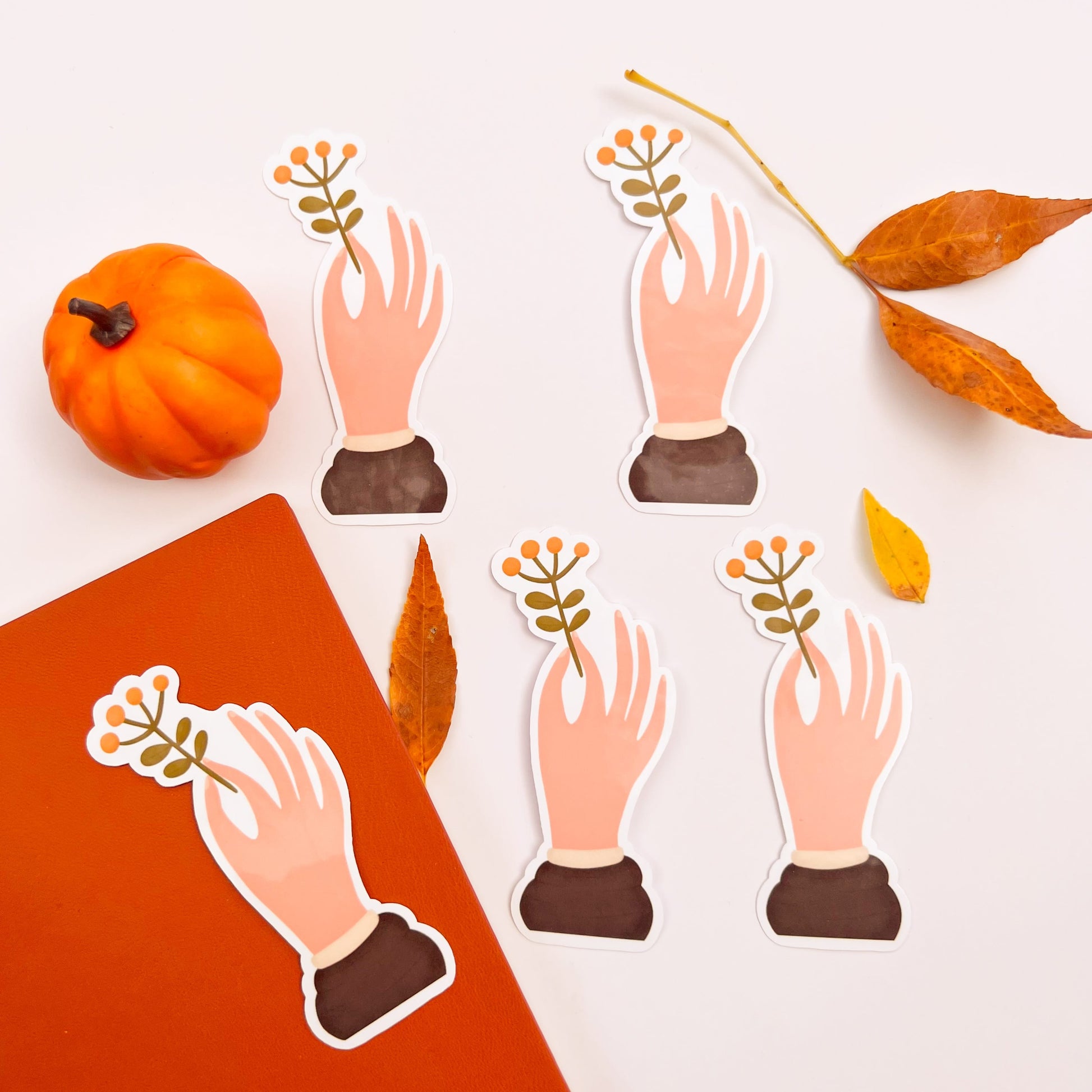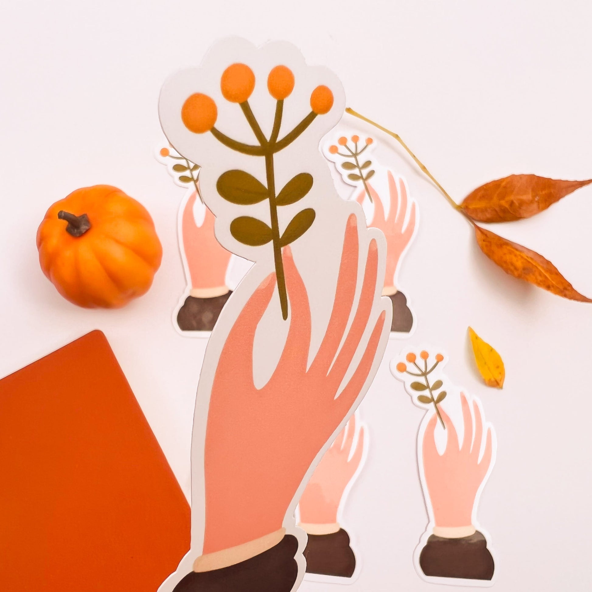 The composition highlights simplicity and delicacy. The hand extends with grace, gently holding the flower's stem in a way that suggests a respectful and attentive touch. The flower itself is an abstract representation of nature's splendor, with shapes hinting at petals and leaves. The colors chosen for the sticker are soft and soothing, evoking natural tones that inspire tranquility and serenity.