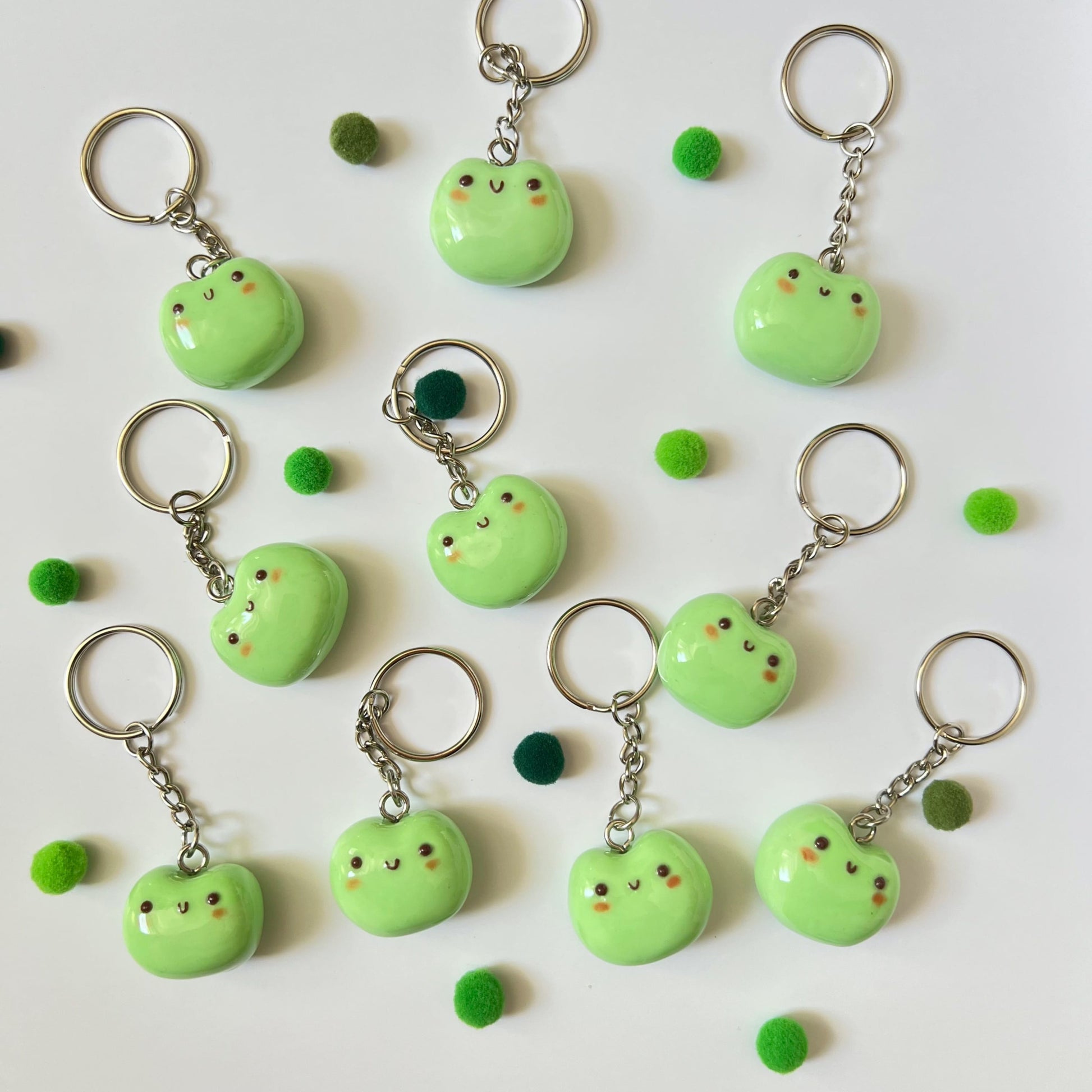 Add a touch of cuteness to your keyring with our super adorable enchanted frog polymer clay Keychain. Each piece is meticulously hand-modeled and painted with soft shades of pale green, complemented by small red cheeks that add a charming touch. This delightful frog is more than just a keychain; it's a true artistic expression.