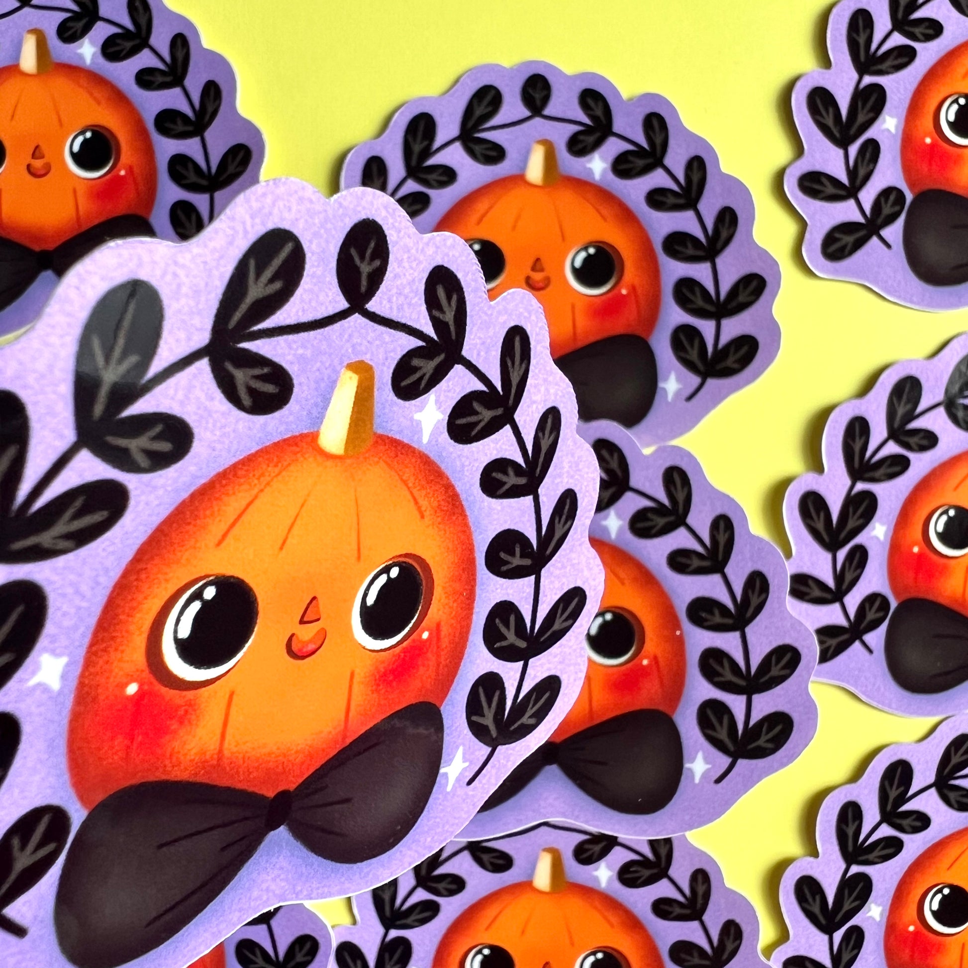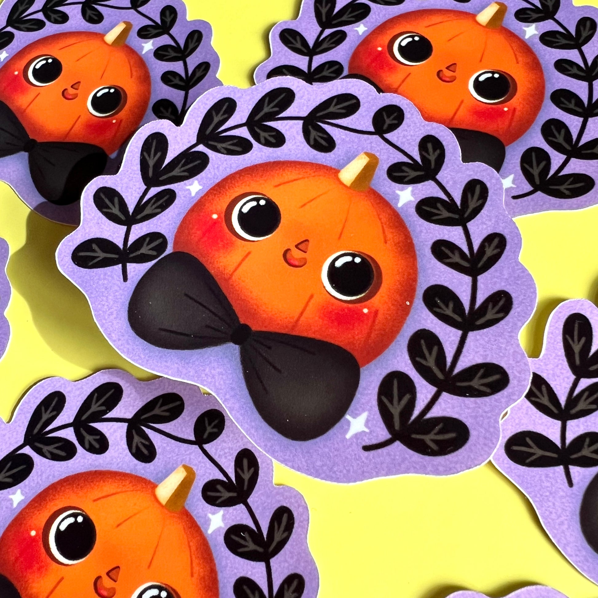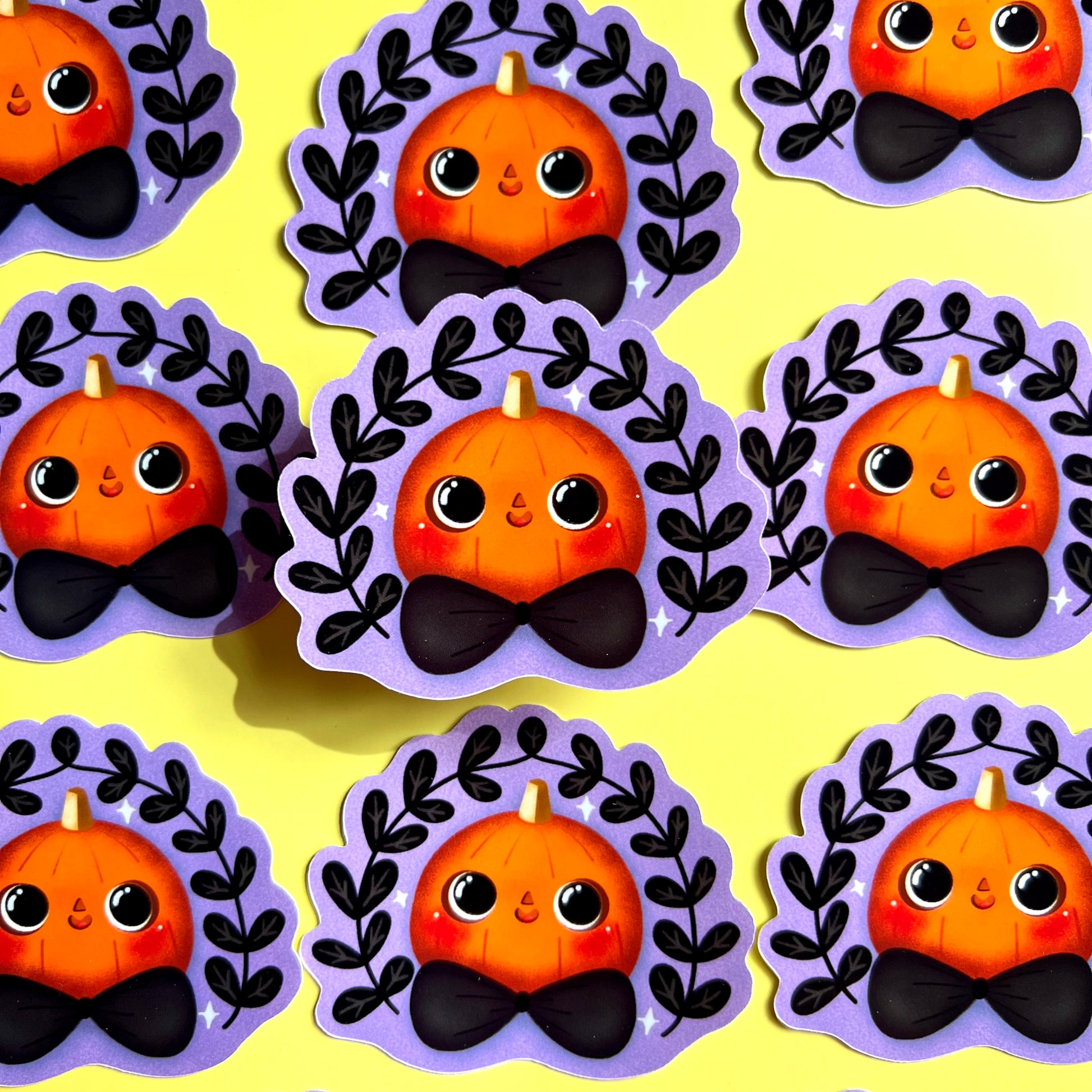 The vivid orange tones of the pumpkin and the deep black of the bowtie create a striking contrast, making this sticker particularly appealing for decorating stationery.
