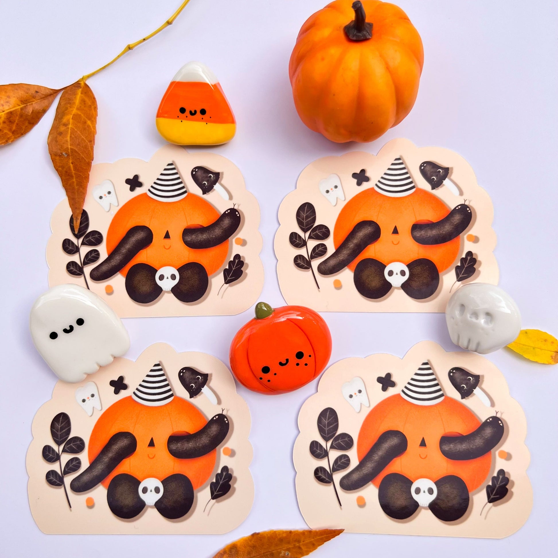This captivating Halloween sticker, featuring a mischievous pumpkin wearing a party hat and a bowtie adorned with a tiny skull, can add an enchanting touch to any paper surface.