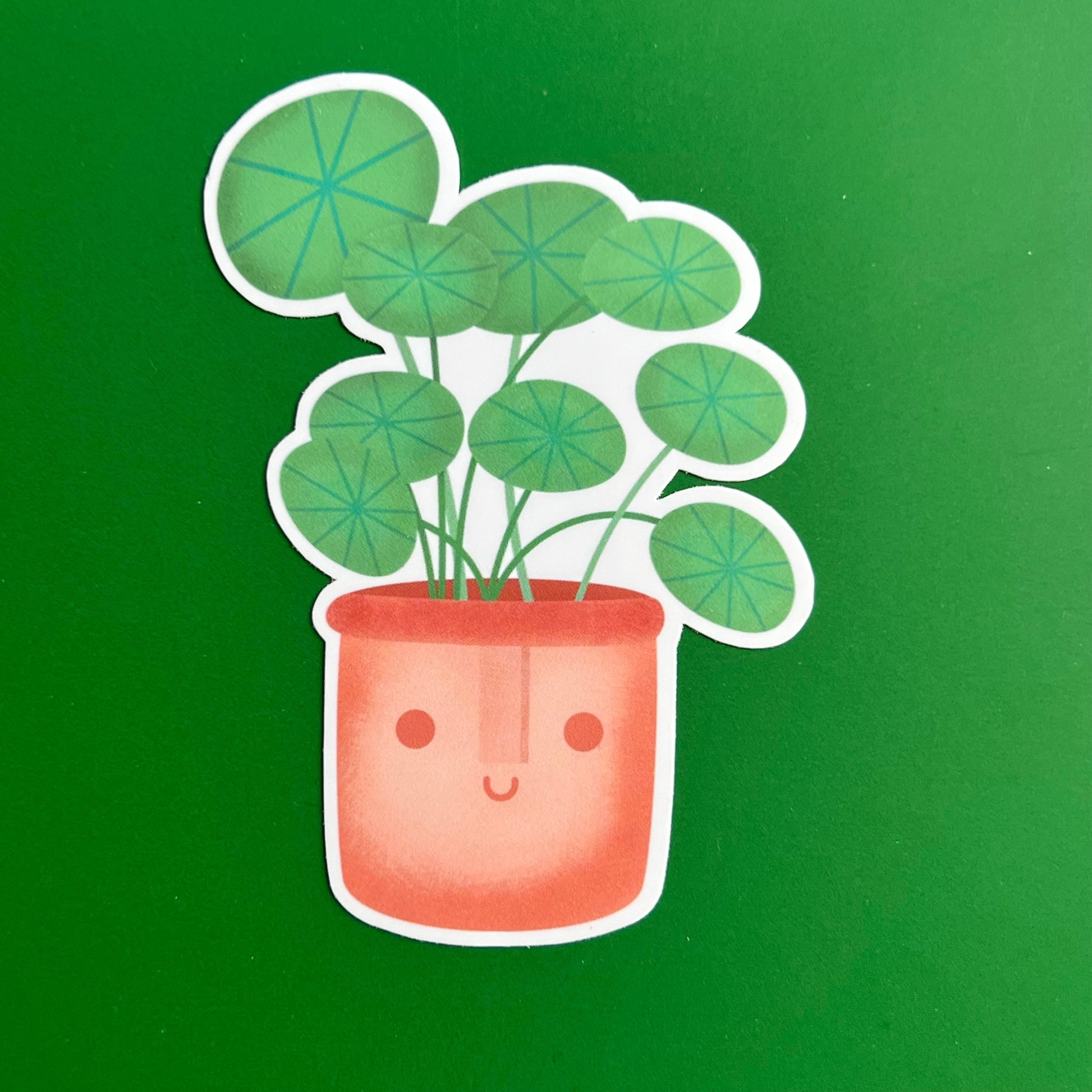 Introducing this adorable sticker featuring a Pilea peperomioides, also known as the "Chinese money plant," in an equally charming terracotta pot. The Pilea peperomioides is a green plant with unique foliage, featuring round and slightly textured leaves that resemble small coins. Its playful appearance and bushy growth habit make it a favorite among indoor plant lovers.