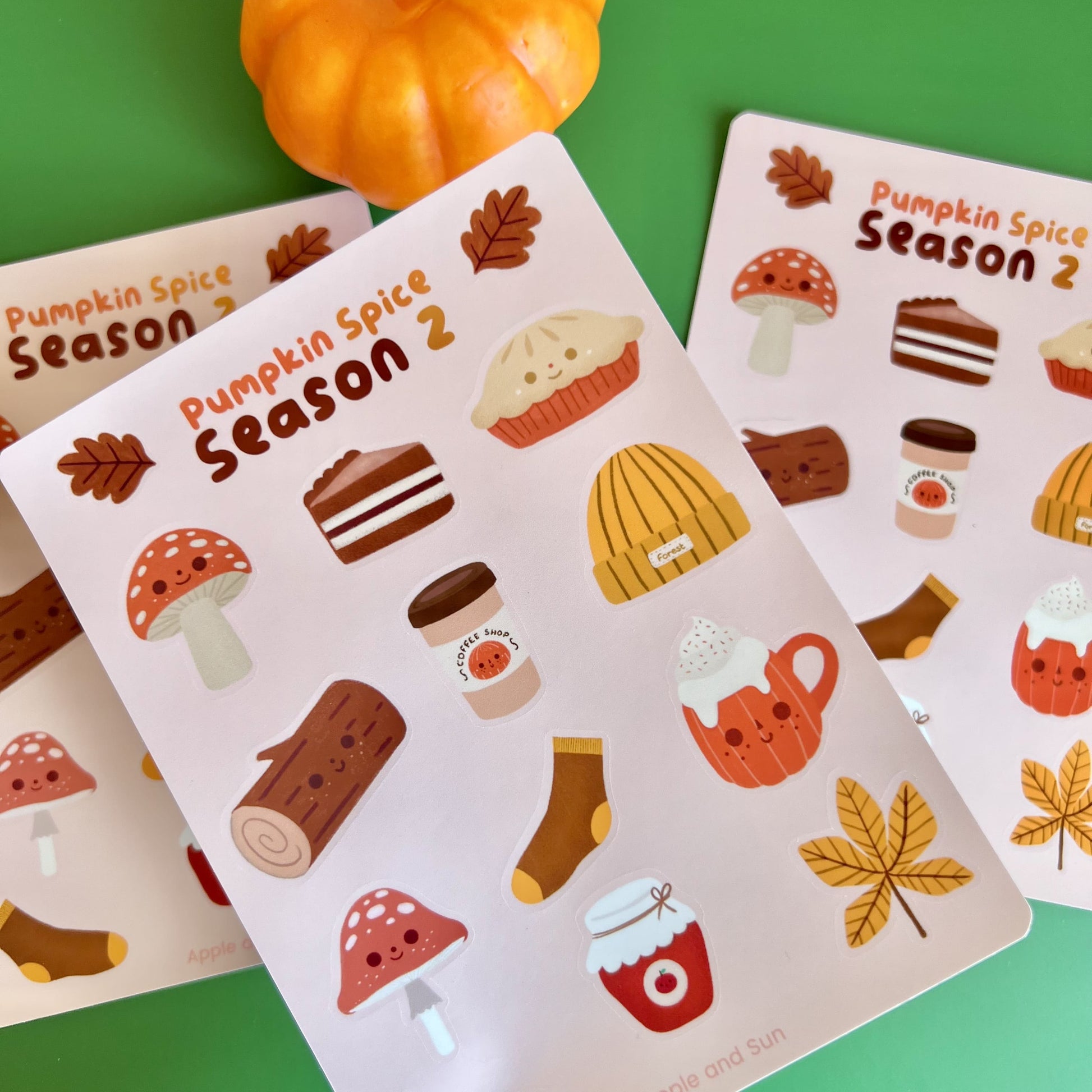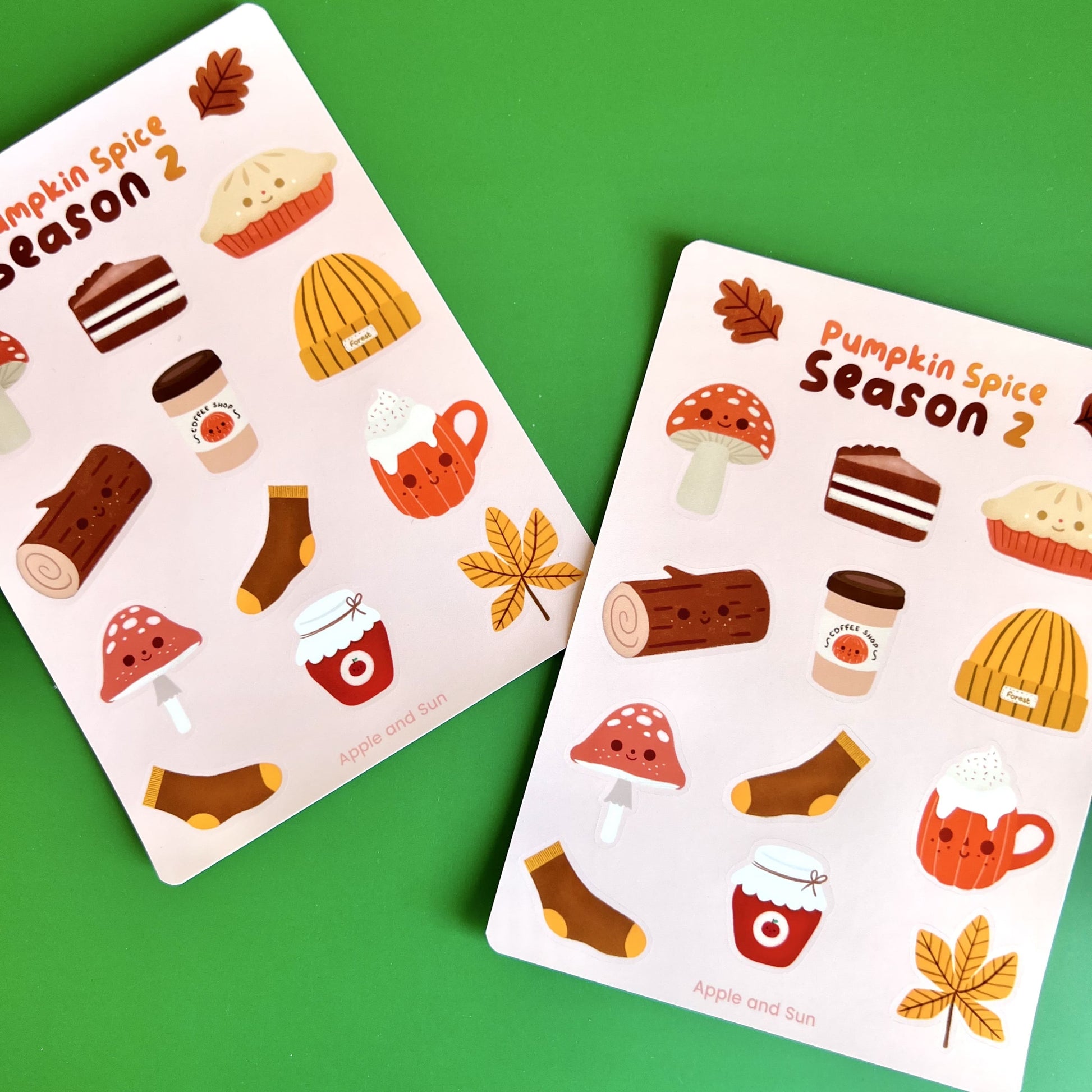 Immerse yourself in the magic of autumn with our Autumn sticker sheet! Wrap yourself in a warm and cozy ambiance with these stickers featuring soft, autumnal colors. Picture yourself indulging in a pumpkin pie while sipping on a hazelnut latte, or snuggling up in a woolly hat with equally cozy mittens!