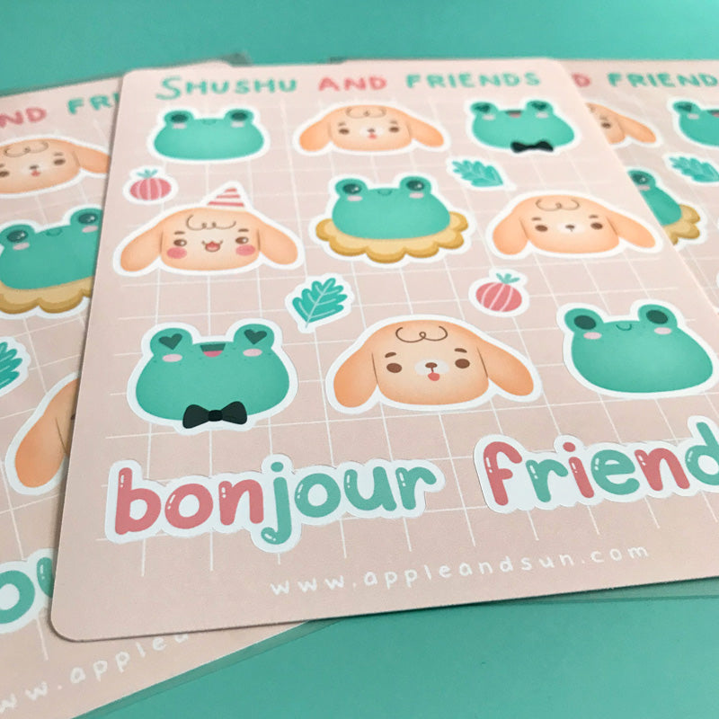 As you carefully peel off each sticker, you feel its gentle texture between your fingers, and you can almost hear Shushu barking and the frog softly croaking in the air. They patiently await to add a playful charm to your letters, notes, and projects.