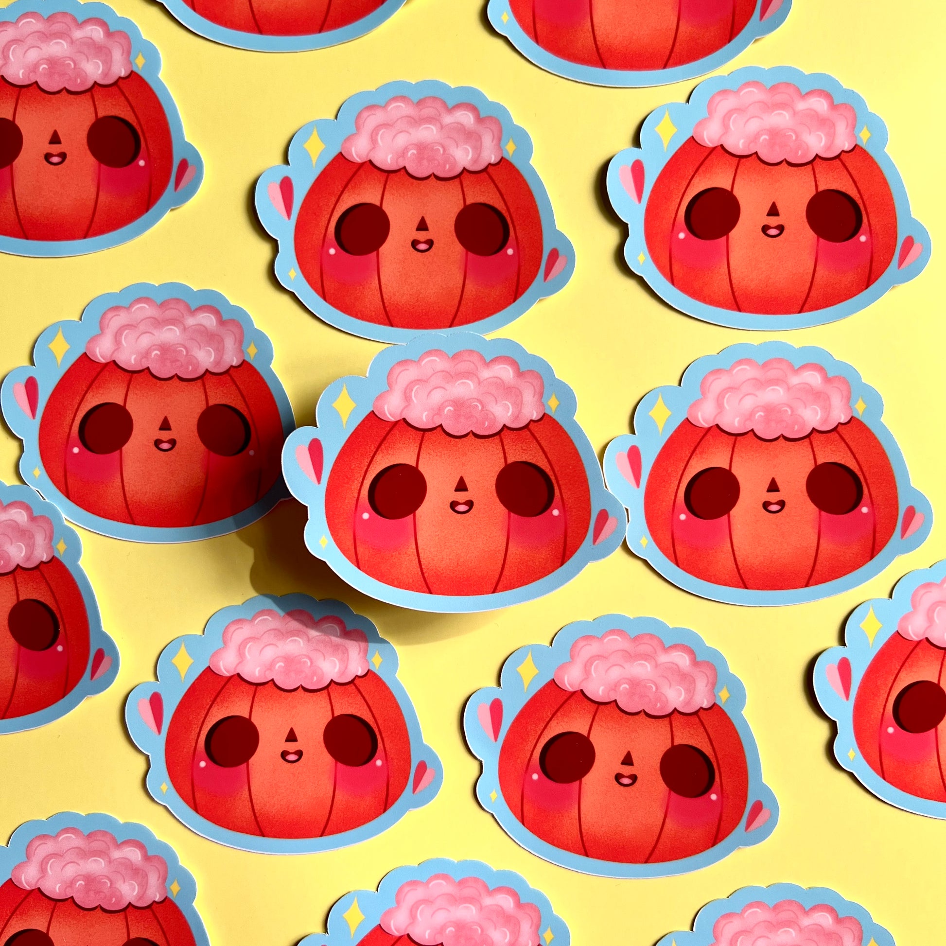 The entire sticker exudes a festive Halloween atmosphere with a touch of morbid humor. It alludes to the popular cliché of zombies craving human brains while injecting an element of innocence through the presence of this friendly pumpkin. It's the perfect balance between horror and fun that captures the playful spirit of the Halloween season.
